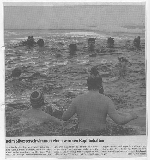 Bericht am 30.12.2005 in den Mittelschwäbischen Nachrichten Geschrieben von Nico-Alexander Harder am 30. Dezember 2005. Veröffentlicht in Zeitungsartikel. Silvesterschwimmen Zurück Weiter Nico-Alexander Harder